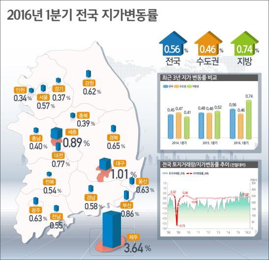 3일 국토교통부가 낸 ‘2016년 1분기 전국 지가변동률’ 자료에 따르면 올해 1분기 세종의 순수토지거래량은 2485필지로 지난해 1분기 1094필지에 비해 127.1% 증가했다.