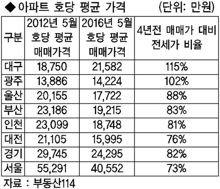 대구의 가구당 평균 전세가격은 2억 1582만 원으로 4년 전 매매가격 평균(1억 8750만 원)보다 높다. 광주 역시 가구당 평균 전세가격은 1억 4224만 원으로 4년 전 매매가격(1억 3886만 원)을 넘어섰다.