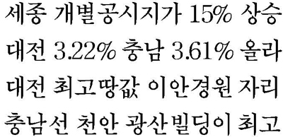 충북은 5.36% 올라 전국 평균을 상회했으며, 충남은 3.61% 올랐고, 대전이 3.22%로 전국에서 가장 낮게 오른 것으로 나타났다.