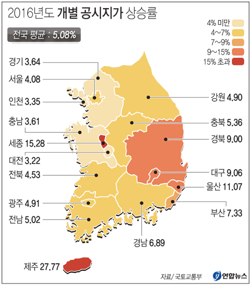 국토교통부는 전국 252개 시·군·구별 관할 시장·군수·구청장이 올해 1월 1일을 기준으로 3230만 필지에 대한 개별공시지가를 산정한 결과 지난해보다 평균 5.08% 올랐다고 30일 밝혔다.