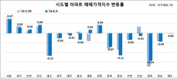 대전은 0.05%로 전주(0.06%)보다 상승폭이 0.01%포인트 떨어졌으며, 충북은 0.06%에서 0.01%로 상승폭이 축소됐다.