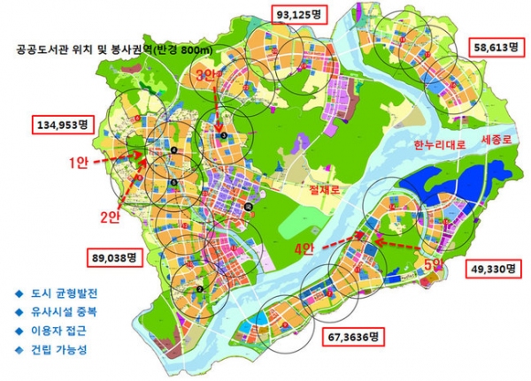 시는 지난 13일 종촌복지센터에서 세종시립도서관 건립 기본계획 연구용역 결과를 보고하며 주민설명회를 개최했다. 이날 시는 “용역결과 건립 장소는 1-1생활권(고운동)과 4-1생활권(반곡동) 중 결정될 전망”이라고 밝혔다.