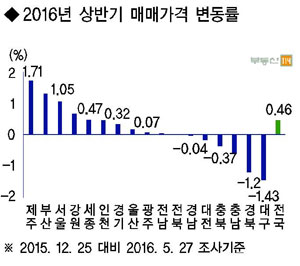 올해 상반기 전국 아파트 매매시장은 0.46% 변동률(2015년 12월 25일 대비 2016년 5월 27일 기준)로 보합세를 보였다.