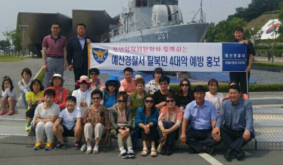 예산경찰서가 보안협력위원들과 함께 지난 17일 관내 북한이탈주민과 결혼이주여성 등 다문화가족 30명과 아산 현충사로 소통여행을 다녀왔다. 여행 출발에 앞서 김황구 예산경찰서장은 가정폭력 등 4대악 관련 예방을 여행 참가자들에게 당부했다. /예산경찰서 제공