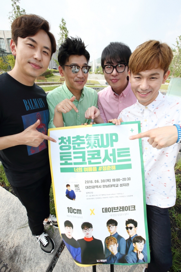 KT는 30일 오후 7시 대전 한남대 성지관에서 ‘청춘기업(청춘氣UP) 토크콘서트-너의 여름을 #청춘해’를 개최한다. 지난 3월 시작된 청춘기업 토크콘서트는 매월 마지막 주 전국 곳곳의 청춘들을 응원하기 위해 KT가 진행하는 행사로, 사진은 이번 콘서트를 함께할 홍대 훈남밴드 ‘데이브레이크’ 멤버들이 포즈를 취하는 모습. KT 제공