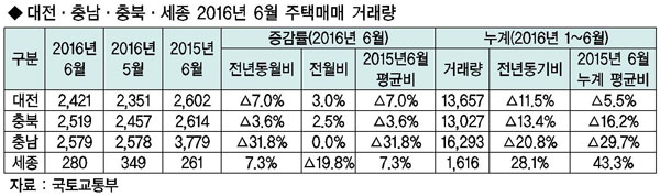 충남의 올해 상반기 전국 주택 매매 거래량은 1만 6293건을 기록해 지난해 같은 기간보다 20.8% 하락했다. 지난달 주택 매매 거래량도 2579건으로 전년 동기 대비 31.8% 줄었다.