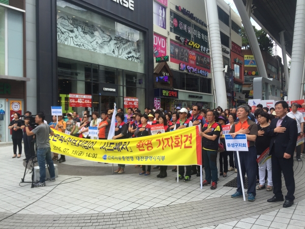 한국자유총연맹 대전시지부(회장직무대행 정장우)는 15일 오후 대전 으능정이 거리에서 회원 300여 명이 참가한 가운데 정부의 사드(THAAD), 고고도미사일방어 체계의 주한미군 부대 배치 결정을 전폭적으로 지지하는 내용의 기자회견을 가졌다. 한국자유총연맹 대전시지부 제공