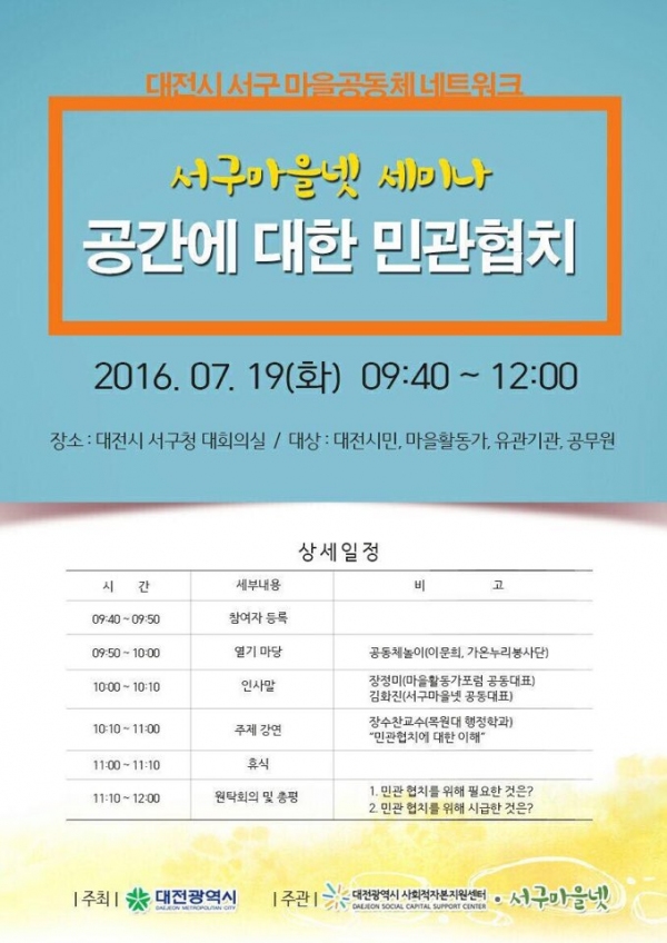 대전시가 주관하고, 사회적자본지원센터와 서구마을넷이 주최하는 이번 세미나는 19일 오전 9시 40분부터 낮 12시까지 서구청 대회의실에서 열기마당(공동체놀이-이문희 가온누리봉사단),주제강연(장수찬 목원대 행정학과 교수 ‘민·관 협치에 대한 이해’), 원탁회의(민·관 협치를 위해 필요한 것과 시급한 것) 등으로 진행된다.