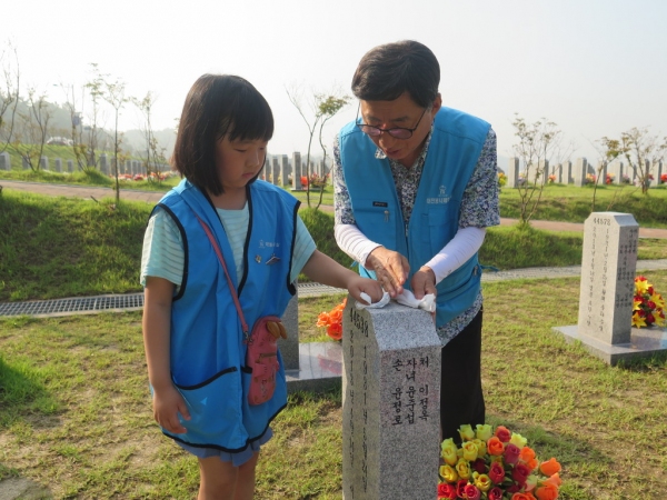 권흥주 회장님께서는 저를 위해 일부러 장난도 쳐주시고 초콜릿도 주셨습니다. 묘비 닦기를 시작하기 전 ‘이달의 현충 인물’인 김점곤 소장 묘역에 참배하고, 대전현충원 권율정 원장님으로부터 6·25전쟁 당시 김점곤 소장이 지휘하는 제1사단 12연대와 학도병 500여 명을 포함한 7600여 명의 우리 군이 1950년 8월 3일부터 9월 2일까지 약 한 달에 걸쳐 엄청난 병력 차이를 극복하고 북한군의 공세를 끝까지 막아낸 낙동강 다부동 전투의 상세한 내용을 듣게 되었습니다. 전쟁이 뭔지도 모르는 나도 ‘나라를 잘 지켜야겠다’라는 다짐의 마음이 생겼습니다.