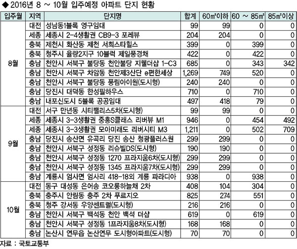 8월 천안제3산단 1269세대, 9월 세종3-3생활권 2157세대, 충남 계룡 928세대, 10월 충주 안림 825세대 등이 집들이를 한다.
