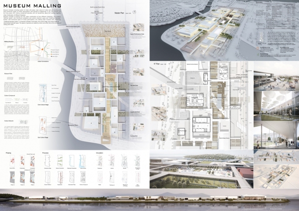 ‘Museum Malling’은 어반 몰이라는 중심부 공간에 각 박물관을 연계하여 다양성을 유지하면서도 어반몰을 통해 전체 박물관단지의 통합된 이미지를 제시하고자 한 작품이다. 박물관 단지 전체를 다양한 규모의 공간으로 분절하고 휴먼스케일의 보행 친화적인 공간 네트워크를 제공해 이용자의 상호교류를 극대화한 아이디어로 평가 받았다.