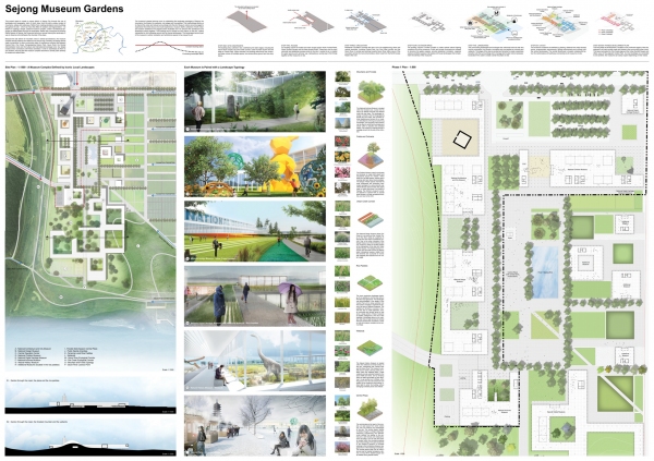 ‘Sejong Museum Gardens’ 는 격자형 기본구조를 바탕으로 중앙에 광장을 두고 양쪽으로 박물관 배치를 제안한 작품이다. 도시성과 자연성을 유연성 있게 연결해 공간적인 질서를 논리적으로 구현했다는 점에서 높은 평가를 받았다. 또 채로운 조경기법과 유리로 형성된 통로를 통해 중앙공원, 천변과 어우러지는 박물관 정원으로써 아름다운 풍광을 제공한 점이 우수하다.