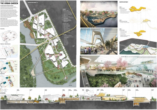 ‘The Urban Garden’은 많은 작품들이 단지 전체를 격자형 구조로 제시한 것과 대비되는 독특한 유기적 구조의 파빌리온 건물로 구성된 도시정원이라는 정체성을 제안한 작품으로 평가받았다. 단지 가운데 위치한 아트리움 형태의 어반 로비를 중심으로 하는 보행몰과 박물관들 사이에 배치한 작고 다양한 오픈 스페이스들을 연결해 다채로운 보행환경을 제공한다.