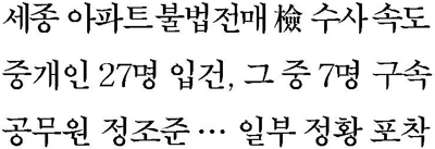 대전지검은 26일 세종시 아파트 분양권 불법전매 행위와 관련해 공인중개사 A 씨와 중개보조인 B 씨 등 부동산 중개업소 종사자 27명을 불법전매 알선(주택법 위반) 혐의로 입건했다. 검찰은 이 가운데 7명을 구속기소했다.