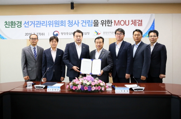 행정중심복합도시건설청(청장 이충재)과 중앙선거관리위원회(사무차장 김대년, 이하 중앙선관위)는 27일 정부세종청사 6-3동 행복청 종합상황실에서 친환경 세종시선거관리위원회(이하 세종시선관위) 청사건립을 위한 양해각서를 체결했다.