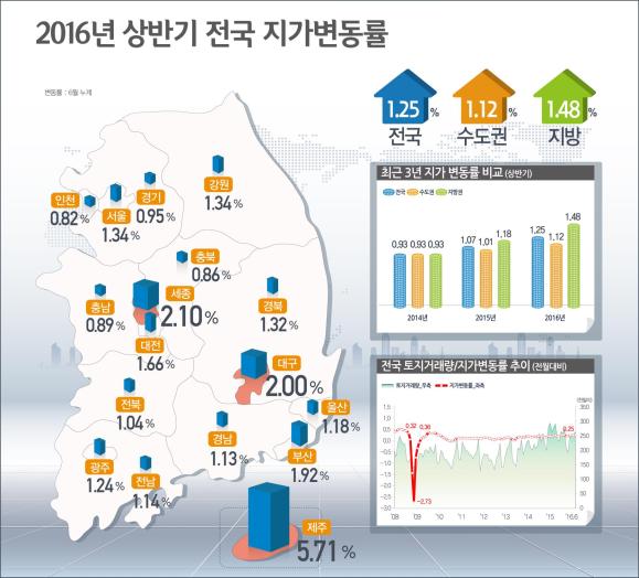 세종은 행정중심복합도시 개발이 땅값에 영향을 미친 것으로 분석됐고, 특히 세종시 한솔동·나성동(3.47%), 금남면(2.53%) 땅값이 상승률로 따졌을 때 높은 편이었다.