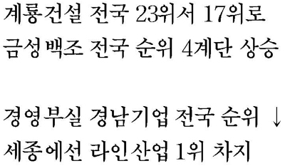 충남 소재 경남기업(7638억 원)은 작년 전국 순위 29위에서 올해는 35위로 하락했다.