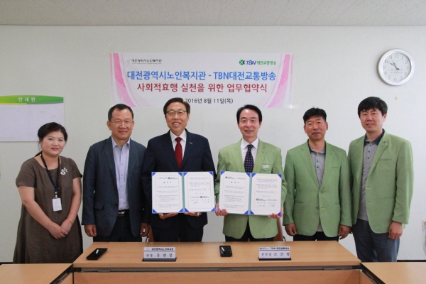 TBN대전교통방송(본부장 조신형, 오른쪽에서 세 번째)은 지난 11일 대전시노인복지관(관장 유한봉)과 사회적 효행 실천을 위한 업무협약식을 가졌다. 대전시노인복지관 제공