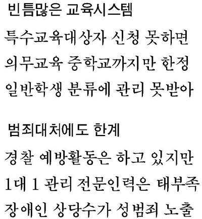 그러나 교육당국을 비롯한 사회시스템은 가정에서 이탈된 이들을 제대로 보호하지 못했다. 이는 교육 시스템상의 문제에서 기인하는 바가 적잖았다. 상당수 장애인 청소년이 장애인으로 누려야 할 권리를 받지 못하고 있다. 한 예로 특수교육대상자 신청이 그랬다. 장애를 가진 청소년이 특수교육대상자에 신청되면 고등학교까지 의무교육을 받고 장애 청소년으로 관리가 가능하지만 사회의 방치 속에 신청이 되지 못하면 일반 학생과 똑같은 중학교까지만 의무교육을 받는 상황에 놓이게 된다. 결국 장애 학생과 일반 학생의 구분이 애매해지는 상황이 발생하는 것이다. 한 여성장애인단체 관계자는 “열악한 가정의 장애 학생들이 신청하지 못할 경우 특수교육대상자가 되지 못할 수도 있다는 점에서 시스템상 문제가 있다”고 지적했다.