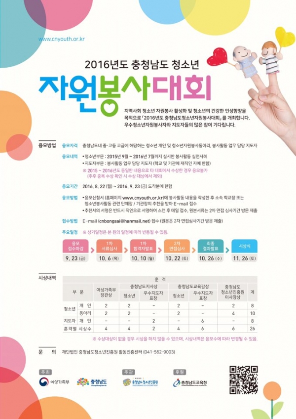 여성가족부와 충남도가 주최하고, 충남청소년진흥원이 주관, 충남도교육청이 후원하는 이번 대회는 지역사회 청소년 자원봉사 활성화와 건전한 인성 함양을 도모하기 위한 것으로 여성부장관상과 충남도지사상, 충남도교육감상 등 총 26개 상이 수여된다.