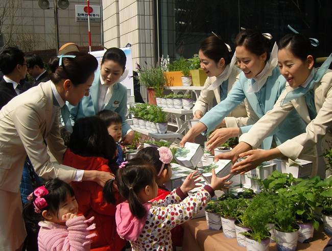 대한항공은 식목일을 맞아 사무실이나 가정에서 직접 키울 수 있는 식물 재배 키트(Kit)를 고객과 시민들에게 제공한다.대한항공 대전지점에 따르면 오는 5일 청주를 비롯해 김포, 제주 등 국내선 12개 공합 탑승수속 카운터에서 승객들을 대상으로 허브 재배 키트를 선착순 제공한다.대한항공이 배포하는 키트는 가정에서 허브 씨앗을 직접 심고 키울 수 있도록 씨앗과 배양토가 별도로 포장돼 있고, 파종 후 7~10일 후면 발아해 간단하게 허브를 키우는 재미를 느낄 수 있다. 이날 증정되는 허브는 스위트바질, 레몬밤, 세이지 등 3종이다.대한항공은 1998년부터 매년 식목일에 꽃씨와 소나무, 야생화 등 식물 재배 키트를 시민들과 고객들에게 나눠주고 있다. 지난해에는 열매를 맺을 수 있는 미니 토마토 재배 키트를 증정해 큰 인기를 끌었다. 한편 대한항공은 식목일 친환경 행사 외에도 ‘1사 1산, 1하천 가꾸기 운동’ 등을 통해 환경 캠페인을 해마다 전개하고 있으며, 몽골·중국 사막지역 및 미국 LA에서 나무를 심는 ‘글로벌 플랜팅 프로젝트’를 펼쳐나가고 있다.