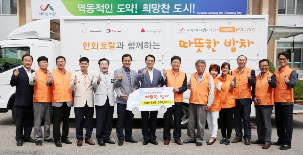 한화토탈은 6일 서산시청에서 이완섭 서산시장, 이은 한화토탈 경영지원실장과 관계자들이 참석한 가운데 ‘따뜻한 밥차’ 전달식을 갖고 1억 5000만 원 상당의 이동식 밥차와 운영비 1500만 원도 함게 서산시에 기증, 지원했다.