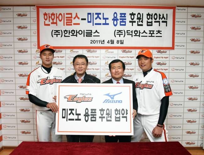 프로야구 한화이글스(대표 김관수)가 ㈜덕화스포츠(대표 김창범)와 용품 후원 협약을 체결했다.한화이글스는 지난 8일 LG트윈스와의 대전 홈경기에 앞서 용품 후원업체인 ㈜덕화스포츠(미즈노)와 용품 후원 협약식을 체결했다.이날 협약식에서 한화 최진행과 윤규진이 선수단을 대표해 기념촬영의 시간을 가졌다.미즈노의 한국법인인 ㈜덕화스포츠는 2006년부터 6년간 한화이글스에 용품을 후원하고 있으며, 올해에는 5억 원 상당의 야구용품을 후원할 계획이다.
