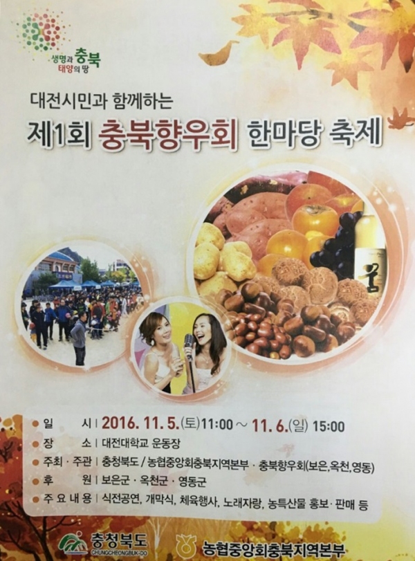충북도와 농협중앙회 충북지역본부가 주최하고, 충북향우회(보은·옥천·영동)가 주관하는 이번 행사는 출향인들에게 고향에 대한 정취를 선사하고, 대전과 충북의 우의를 도모하고자 식전공연과 개막식, 체육행사, 노래자랑, 농특산물 홍보·판매전 등으로 진행된다.