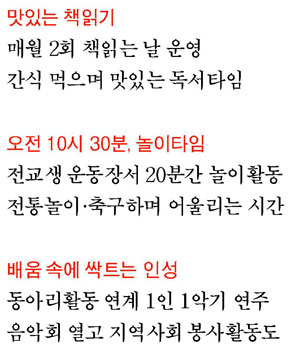 특히 학년별 국어 교과에 10시간을 늘려 ‘온 작품 읽기’ 교육과정 재구성 수업을 전개하고 있다. 학년별 온 작품 읽기 목록을 선정하고, 교육과정과 연계한 온 작품 읽기를 통해 맞춤형 독서교육을 만들어 가고 있으며, ‘꿈틀 기록장’을 제작해 짜임새 있는 독후활동을 병행하고 있다.