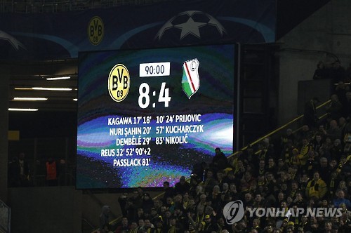 보루시아 도르트문트는 23일 오전(한국시간) 독일 도르트문트 지그날 이두나 파크에서 열린 2016-2017 UEFA(유럽축구연맹) 챔피언스리그 조별리그 F조 5차전에서 레기야 바르샤바(폴란드)와 난타전 끝에 8-4의 대승을 거뒀다.