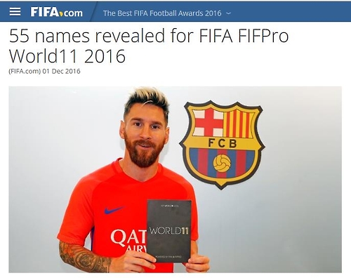 국제축구연맹(FIFA)과 국제축구선수협회(FIFPro)가 올해 최고 활약을 펼친 선수 베스트11을 뽑는 'FIFA FIFPro 월드11 2016'의 최종 후보 55명을 발표했다.