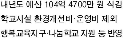 주요 삭감 사업은 학교시설교육환경개선비가 26건, 학교운영비 지원이 42건 등 대부분 일선 학교 시설 개선이나 운영비에 집중돼 내년 일선 학교들의 교육환경 개선은 기대하기 어렵게 됐다.