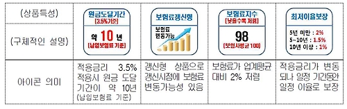 적용금리 3.5% 기준으로 원금에 도달하는 데 10년이 걸린다거나, 갱신형 상품이기 때문에 갱신 시점에 보험료가 인상될 수 있다는 내용의 아이콘 24개가 보험상품의 핵심 내용을 알린다.
