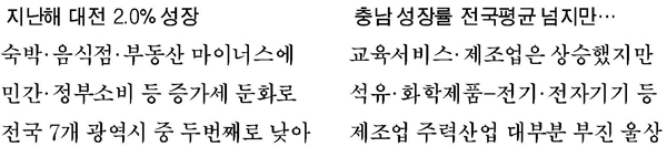 충남의 경우 전국 중위권의 경제성장 속에서도 주력 사업의 부진이 여전했고 대전의 경제성장률은 전국 평균을 크게 밑돌아 향후 전망을 어둡게 했다.