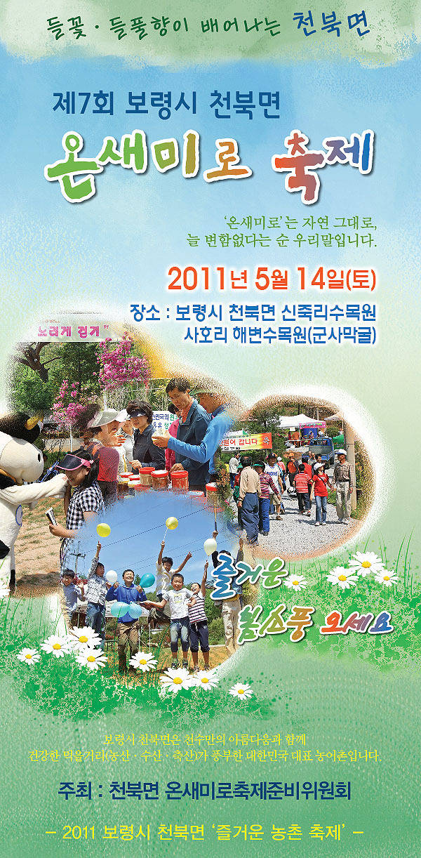 농촌문화를 체험하고 친환경농산물을 알리는 ‘온새미로 축제’가 14일, 보령시 천북면 신죽리 소재 ‘신죽리 수목원’에서 개최된다. 온새미로축제 추진위원회(위원장 임기동) 주관으로 개최되는 이 행사는 가르거나 쪼개지 않고, 생김새 그대로, 자연 그대로, 언제나 변함없다 는 순 우리말처럼 친환경농업을 알리고 도시민들에게 옛 농촌을 체험할수 있는 계기 마련을 위해 개최된다. 축제는 ‘튼튼한 농촌, 건강한 생명’을 주제로 체험과 전시행사, 시식, 판매행사 등 다양한 프로그램으로 운영된다. 체험행사는 ▲쌈지돈 마을주관으로 두부만들기, 볏집공예, 민속놀이 등 ▲빙도마을, 서각, 지점토 작품만들기 ▲낙농회는 생우유 치즈 만들기 ▲천북부녀회, EM 김치담그기 ▲양돈클러스터사업단은 돼지와 친해지기 등을 준비해 각각 진행된다. 전시행사에서는 시온교회에서 야생화와 천진난만한 아이들 사진, 천북면 풍경을 주제로 들꽃사진전이 개최되며, EM 돼지고기 시식, 쑥 개떡, 봄나물 부침전, 향수풍기는 향토음식 시식행사도 열린다. 특히, 보령시 농업기술센터 지원으로 EM을 이용한 친환경 농업을 실천하고 있는 천북면 지역에서 생산되는 EM 김치, EM 돼지 등을 맛볼 수 있으며, 친환경 농산물을 구입할 수 있어 농축산물직거래로 농업인 소득증대에도 기여할 것으로 기대된다. 축제가 열리는 신죽리 수목원과 사호리 해변수목원에는 벌노랑이, 바위솔, 둥근앞꿩의비름, 쑥부쟁이, 돼지감자, 삼색제비꽃 등 다양한 야생화도 감상할 수 있어 행사장을 찾는 내방객들에게 유익하고 즐거운 시간을 제공하게 된다. 임기동 위원장은 “다양한 들꽃과 농촌 체험을 통해 옛 고향의 정취를 느끼고 건강한 농촌음식을 마음껏 맛 볼 수 있는 기회가 될 것”이라며 “수목원의 아담한 숲길, 산책로가 있어 가족단위 봄나들이를 겸해도 좋을 것”이라고 말했다.