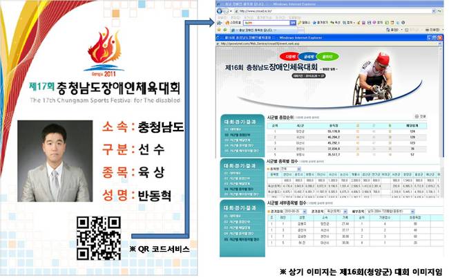 충남도장애인체육회는 제17회 충남도장애인체육대회에서 사상 최초로 시·군 선수단임을 확인하는 ID카드에 스마트폰으로 스캔 가능한 QR(Quick Response) 코드를 삽입, 대회 경기 결과 화면 안내서비스를 제공한다고 12일 밝혔다.모바일 스캔으로 스마트폰에 출력되는 서비스엔 대회 시·군별 종합순위, 참가자 종목별 순위 및 점수 등 경기결과 전반에 대한 내용들이 제공된다.한편 제17회 충남도장애인체육대회는 내달 2일부터 3일까지 이틀간 공주시 일원에서 17개 종목(정식 13, 시범 1, 전시 3) 16개 시·군 대항전으로 개최된다.