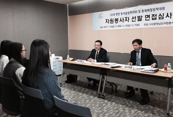 ‘2018 평창 동계올림픽 및 동계패럴림픽’의 성공적 개최를 위한 자원봉사 참여 열기가 뜨겁다. 충남에선 300명 모집에 1346명에 지원한 가운데 ㈔충남자원봉사센터(센터장 지순관) 주관으로 지난 13일 도청 문예회관에서 자원봉사자 선발을 위한 1차 면접 심사가 진행됐다. 충남자원봉사센터 제공