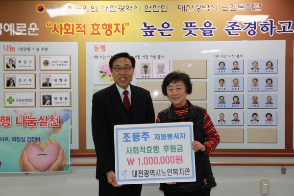 30일 대전시노인복지관에 따르면 지난 2012년부터 복지관에서 다양한 영역의 봉사활동을 펼쳐온 조동주(78) 할머니가 그 주인공으로, 조 할머니는 최근 사회적 효행 후원금 100만 원을 유한봉 관장에게 전달했다.