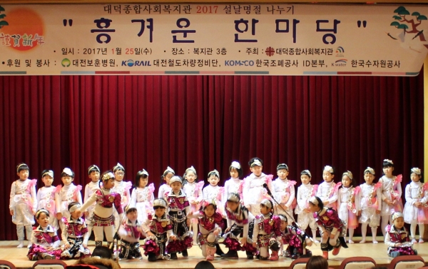 대전 대덕종합사회복지관(관장 김소희)은 대전보훈병원, 코레일 대전철도차량정비단, 한국조폐공사 ID본부, 한국수자원공사 후원으로 지난 25일 지역 소외계층 어르신들을 위한 ‘2017 설날 명절 나누기 흥겨운 한마당’ 행사를 진행했다. 대덕종합사회복지관 제공