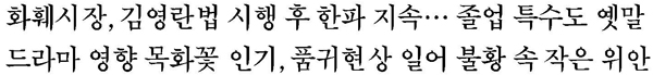 목화꽃 유행은 당분간 계속될 것으로 보이지만 화훼업계가 웃을 수 없는 것 또한 현실이다. 지난해 9월 28일 김영란법 시행 이후 꽃이나 화환을 주고받는 것을 부담스럽게 생각하는 사람들이 늘어 소비위축이 계속되는 탓이다. 꽃집을 운영 중인 한 상인은 “김영란법 시행 이후 꽃이나 화환을 선물했다가 부담을 느껴 다시 되돌려 보내는 경우가 종종 있다”고 귀띔했다.