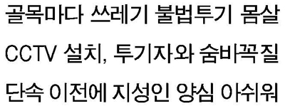 이 같은 문제가 계속되자 해당 구청에선 CCTV를 설치했지만 무용지물이었고 오히려 야음을 틈타 쓰레기를 투기하고 사라지는 경우가 빈번해졌다. 설사 CCTV에 적발되더라도 투기한 사람을 찾긴 쉽지 않다. 원룸에서 자취를 하고 있는 대학생 구 모(26) 씨는 “지난 연말 무심코 이름이 적힌 수업자료를 버렸다가 적발돼 학교에 구청 관계자가 찾아와 과태료를 냈다”며 “창피하기도 하고 이건 아니다 싶어 지금은 올바르게 버리려고 노력하는 편이다”고 말했다.