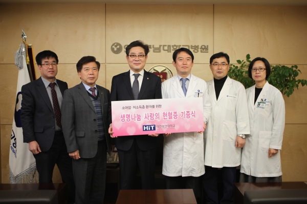 기증 행사는 대전보건대가 지난해 11월 대한적십자사와 대전·세종·충남혈액원 간 연계 진행한 ‘생명나눔 동절기 단체헌혈 행사’에서 302명의 학생들이 500장의 헌혈증서를 기증하면서 마련됐다. 대전보건대는 소아암·저소득층 환자 치료지원을 위해 혈액원과 헌혈 약정을 맺고 정기적인 헌혈을 진행하고 있으며 이번 기증을 통해 어려워진 혈액수급에 큰 도움이 될 것으로 기대하고 있다.
