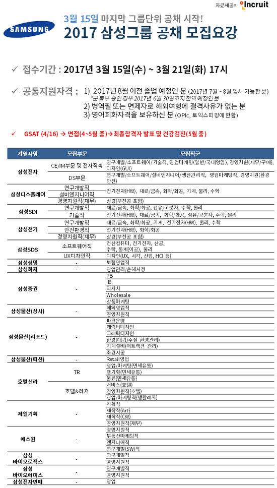 삼성전자 2017 상반기 공채 총정리 바로 가기>>http://school.incruit.com/thou_company/toptencomp.asp?id=seoul&page=2&vodnum=610