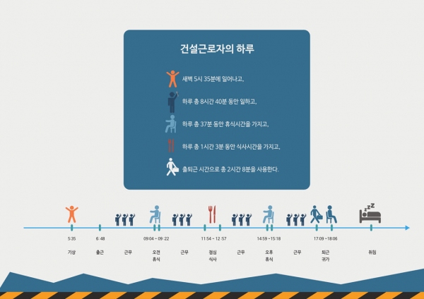 하루 일당 15만 3000원, 일감이 있는 날은 2.5일당 한 번, 평균 연봉은 2300만 원. 새벽 5시 30분에 일어나 1시간의 식사 시간과 37분의 휴식시간, 2시간의 출퇴근시간을 제외하고 하루 8시간 40분을 일하는 건설근로자의 평균 수입이다.