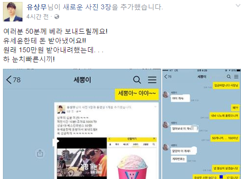 유상무는 유세윤한테 돈을 받아냈다며 즐겁다는 메시지를 보내기도 했다. 유상무는 눈치빠른 시끼라고 절친에 대한 뜨거운 우정을 드러냈다.