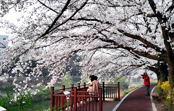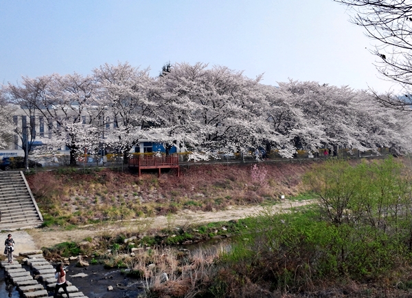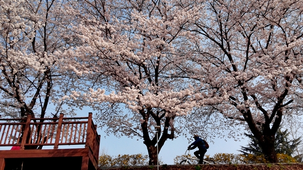 대전의 벚꽃명소 카이스트와 충남대는 벚꽃시즌 벚꽃축제로도 유명하죠. 타슈를 타고 구석구석 벚꽃잎을 따라 유유자적 라이딩 하는 여유가 에너지를 '백퍼' 충전해줄 겁니다. 사람들 붐비는 곳이 싫다면 갑천 쪽을 추천합니다. 시원하게 열린 갑천 자전거도로 옆으로도 벚꽃들이 풍성하게 피어 있습니다.
