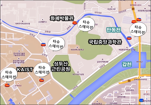 과학관과 탄동천(화폐박물관), 카이스트/충남대 근처엔 타슈를 대여할 수 있는 타슈스테이션, 즉 대여소가 많습니다. 대여소 위치를 먼저 확인한 뒤 출발하는 게 좋습니다. 타슈 어플이나 타슈 홈페이지(https://www.tashu.or.kr)를 참고하시면 됩니다. 기본요금(500원)으로 기본시간(1시간)을 넘기지 않고 '갈아타기'를 활용하면 추가요금을 내지 않고도 장시간 라이딩을 즐길 수 있습니다.