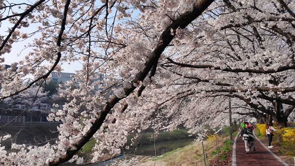 국립중앙과학관이나 엑스포시민광장 등 편한 곳에서 타슈를 대여해서 출발합니다. 과학관 정문 옆 작은 하천(탄동천)을 따라 열린 산책로(자전거길)가 있습니다. 그 길로 접어들면 꽃들의 향연이 시작됩니다. 벚꽃 개나리 등 봄꽃들이 하이파이브 하자고 난리입니다. 향긋한 봄 향기도 진동합니다.