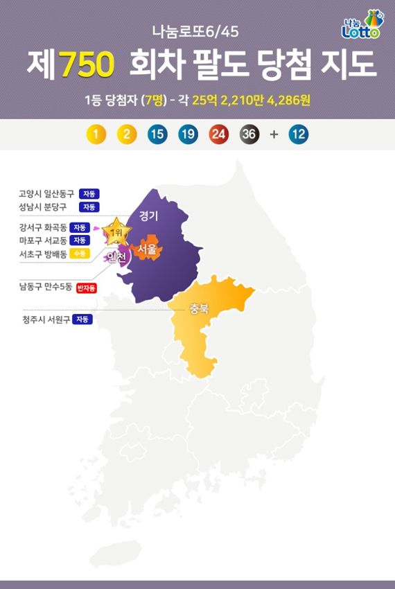 - 750회 로또 1등 당첨점은 어디?…자동5·반자동1·수동1