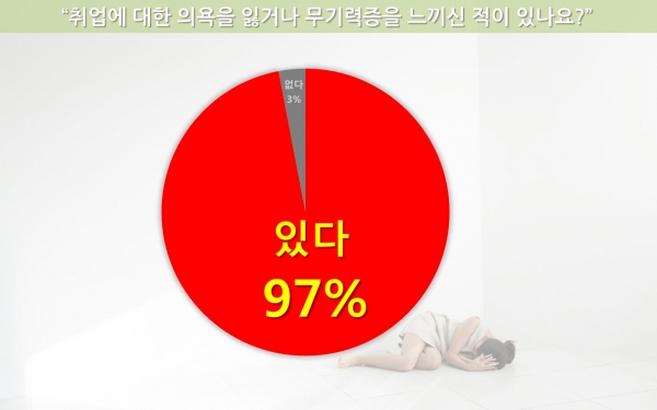 취업포털 인크루트가 최근 구직경험이 있는 성인남녀 회원 700여 명을 대상으로 취업 무기력증에 관한 설문조사를 진행한 결과에 따르면 구직경험자 중 97%가 취업 의욕을 잃거나 무기력증을 느낀 적이 있다고 응답했다. 특히 이들 중 27%는 취업에 대한 의욕 또는 무기력증에 빠지는 강도가 ‘아주 극심하다’고 답했다. ‘극심하다(49%)’는 답변을 포함하면 76%의 응답자가 심각한 수준의 무기력증을 느끼고 있는 것으로 나타나 취업 절벽으로 구직 경험자들이 무기력에 지친 현실이 고스란히 드러났다.